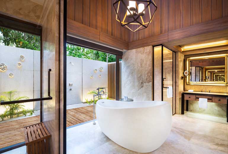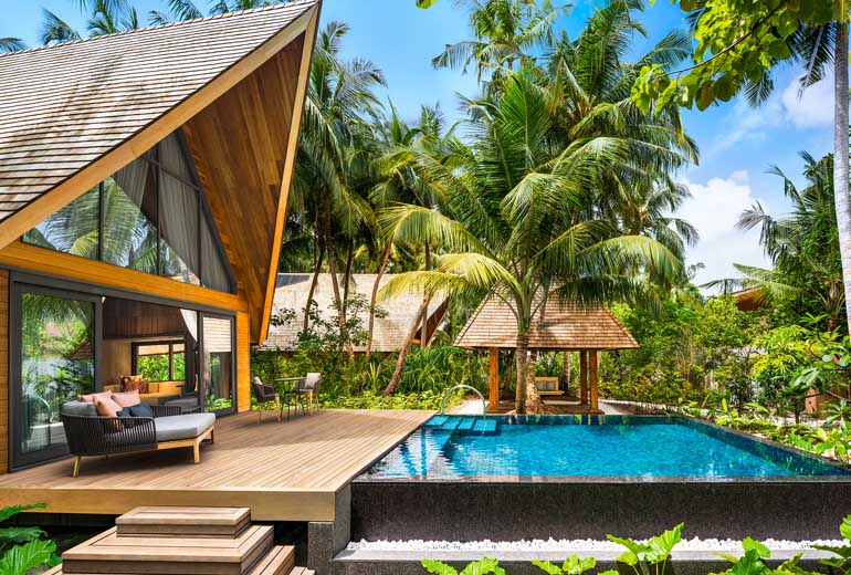 Garden villas sit within preserved native vegetation, keeping the island’s dense greenery intact. Vommuli House, inspired by a banyan tree, anchors family activities and wellness.