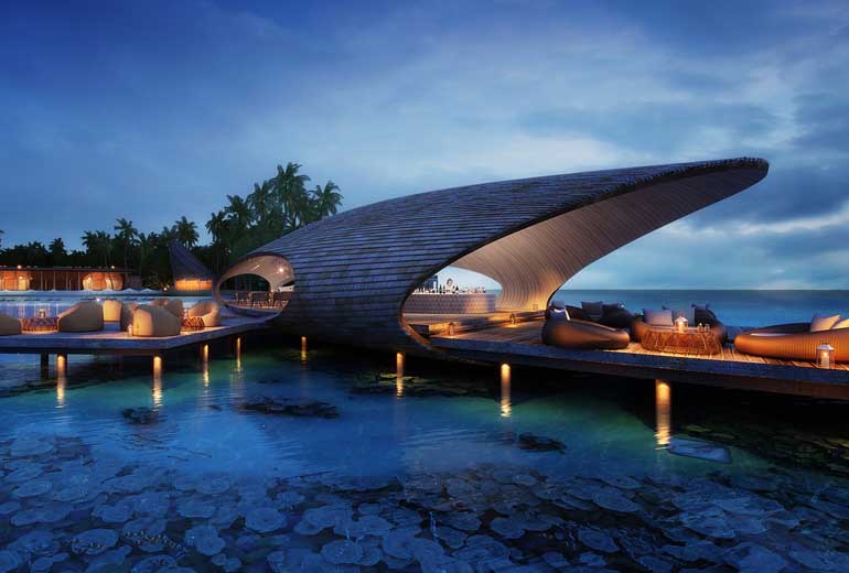 Overwater villas, the Whale Bar, and the spa draw inspiration from manta rays, whale sharks, and crustaceans. This zone highlights the resort’s nature-led, sustainable design approach.