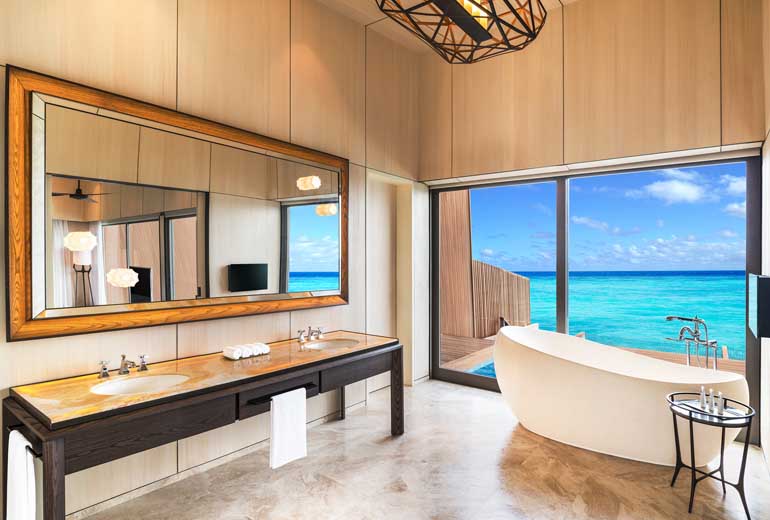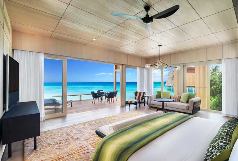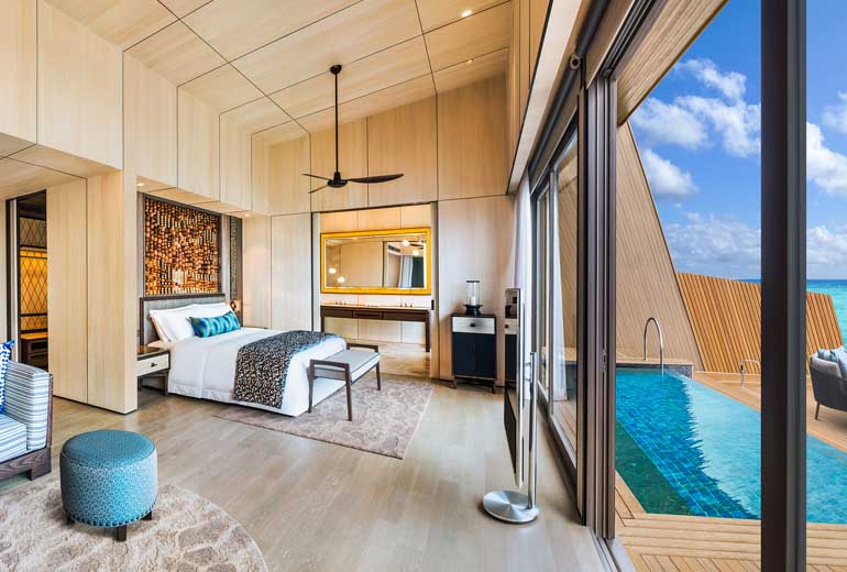 These dhoni-shaped villas sit where the island meets the reef, perched over rock and water. Sail-like roofs and wide verandahs frame some of the island’s most dramatic views.