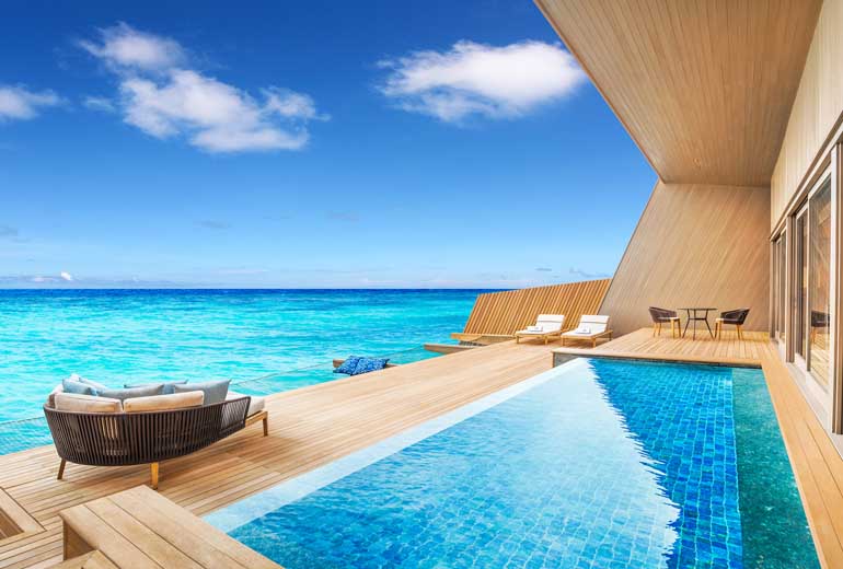 These dhoni-shaped villas sit where the island meets the reef, perched over rock and water. Sail-like roofs and wide verandahs frame some of the island’s most dramatic views.